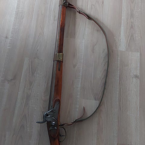 Flintlås,fungerer mekanisk.Limt på flere plasser.115 cm langt.Noen reparasjoner på treverk midt på løp.