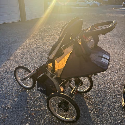 Mountain Buggy barnevogn med tre hjul. Vognen er brukt som barnehagevogn. Usikker på om hjulene er tomme for luft eller punktert. Myggnetting medfølger