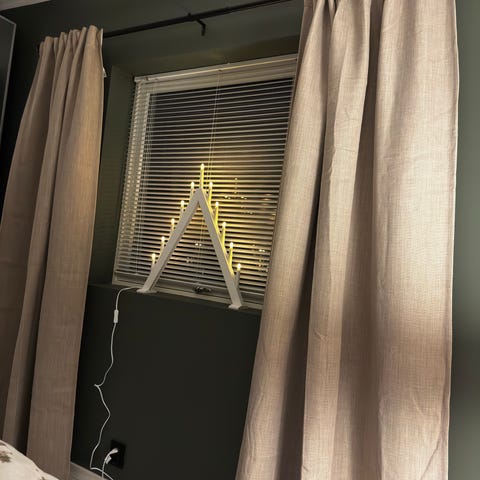 6 stk Tika lystette gardiner selges. Gardinene har hengt oppe kun noen uker og ble kjøpt på Princess i oktober 2025. Tidløst design i fargen beige. Rynkebåndskroker følger med og er påsatt.