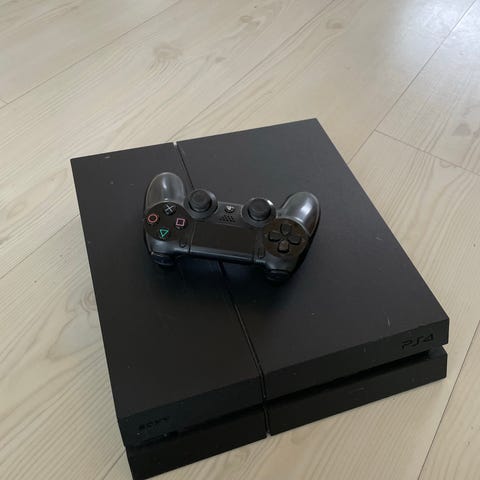 Sony Playstation 4 spillkonsoll med rød trådløs kontroller. Spillkonsollen har standard design og støtter et bredt utvalg av spill for Playstation 4-plattformen.