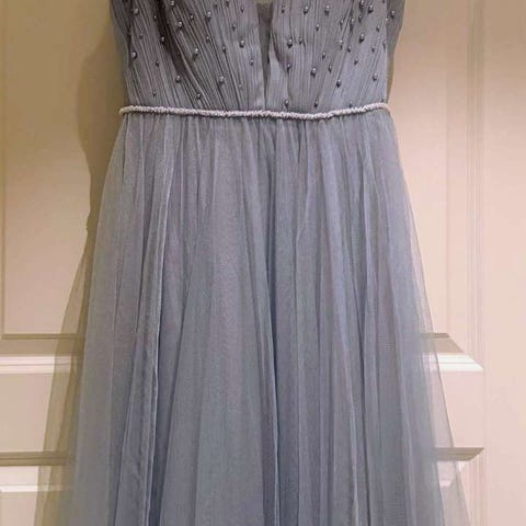 Pent brukt ballkjole i silke fra Eva Sandi, med splitt med venstre fot.