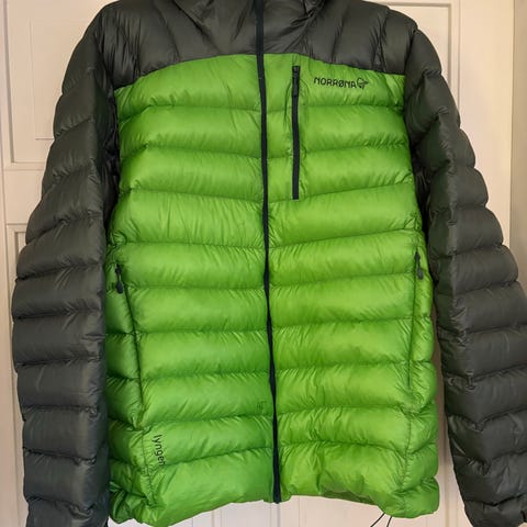 Norrøna lyngen lightweight dunjakke herre. Str L. En liten rift bak på ryggen,men ingen dun-tyting. Glidelåser virker perfekt. Mye jakke her.