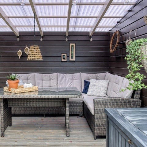 Utemøbel dobbel sofa med bord i flettet materiale og grå puter