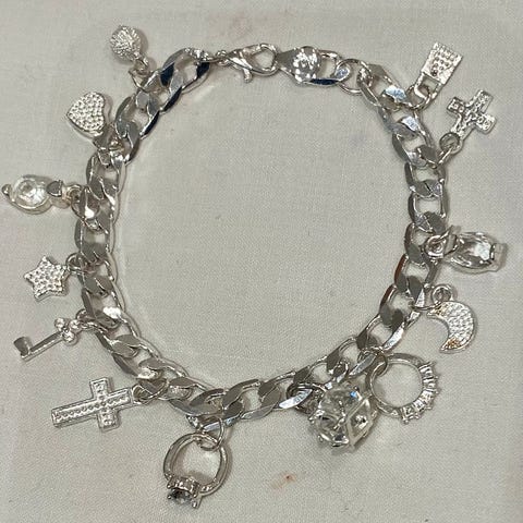 Kraftig og tungt ankerkjetting armbånd 5,4mm i 925S, 22 cm med tre charms. Alle glasscharmsene er nye og ubrukte i 925S. Se bilder for mål og vekt, og zoom inn for detaljer.