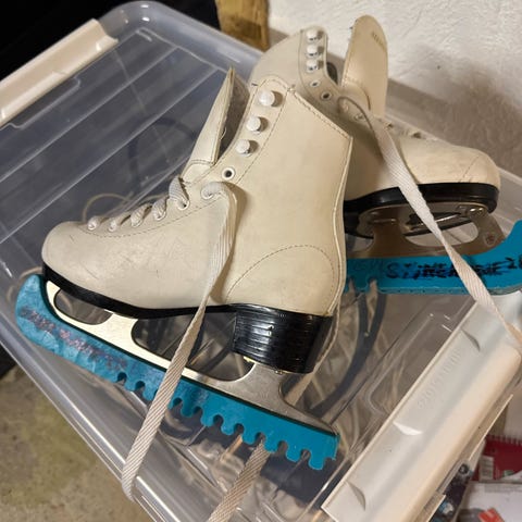 Barneskøyter i størrelse 31 med hvit farge og rosa detaljer. Kun brukt 1 sesong. Medfølgende hjelm.