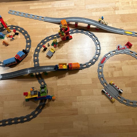 LEGO Annet togskinner i flere deler, hovedsakelig i grå og svart farge. Passer til LEGO togsett og kan brukes til å bygge ulike togbaneoppsett.