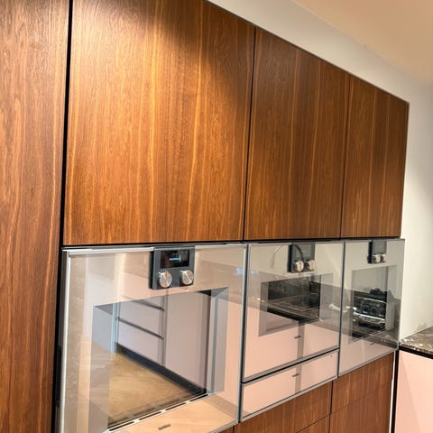 Kjøkkeninnredning i mørk brun eik med skap og skuffer