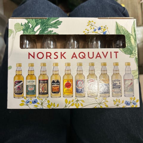 Komplett Norsk Aquavit gave-/samlersett med små flasker fra kjente merker som bl.a. Linie, Løiten og Gammel Opland.