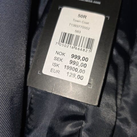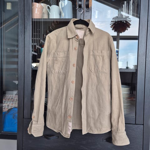 Kjøpt for en 4000-5000 for noe år siden. Blitt for liten for meg. Se bilder for materiale mv. Synlig skade ved lommen på innsiden. Ellers flott og fin. Kan hentes /prøves på Tåsen i Oslo.