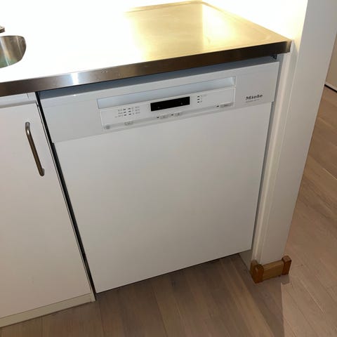 Miele oppvaskmaskin med hvit front. Maskinen har flere programmer for effektiv oppvask og er designet for innbygging i kjøkkenbenk. Den har en digitalt display som viser gjenværende tid og status for vaskesyklusen. Leveres med bruksanvisning.