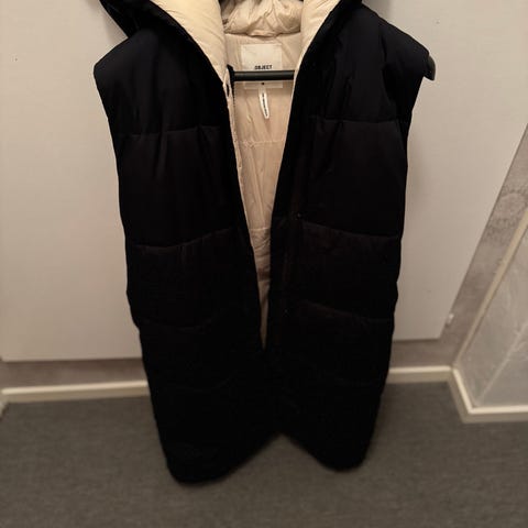 Pels og hette kan kneppes av (hver for seg). Størrelse XS men romslig i størrelsen. Lang jakke/kåpe.