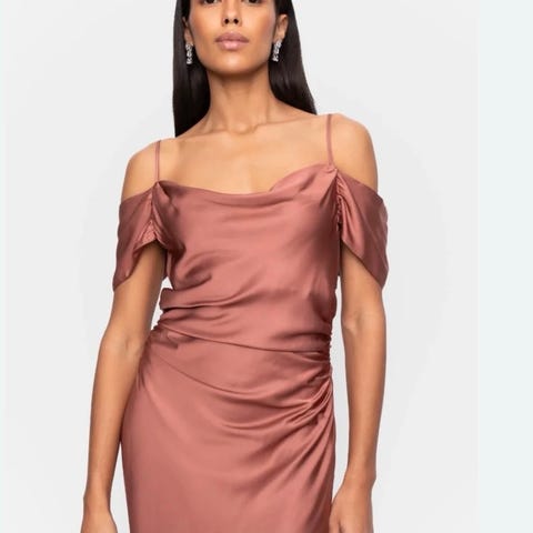 Helt ny Lyra dress fra Camilla Pihl i størrelse 40. Nydelig og elegant kjole i terracotta farge. Kjolen har smale justerbare stropper over skuldrene og off shoulder-ermer, maxi-lengde og lukkes med skjult glidelås på siden. Kjolen er designet med rynking i midjen for en feminim passform. Selges da jeg ikke fikk brukt den som planlagt.