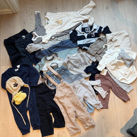 Alle klærne er i god stand. Noen har mindre bruksmerker, noen har nesten aldri vært brukt.