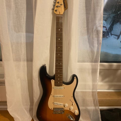 Gitaren har en rød kropp og svart pickguard. Reim følger med. Gitaren har en trehals med stemmeskruer av metall.