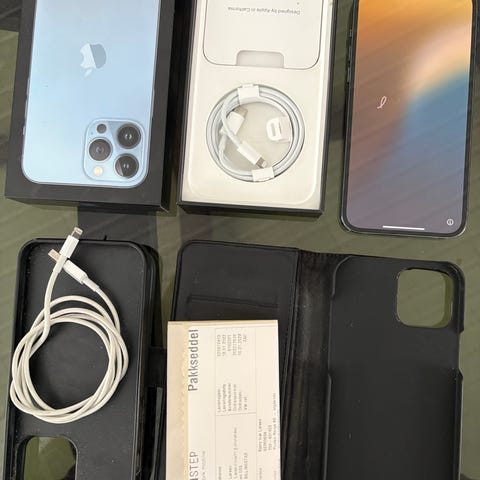Apple iPhone 13 Pro Max mobiltelefon med 256 GB lagringskapasitet. Pent brukt med noe bruksmerker, som vist på bildet. Deksel følger med om ønsket. Batteritilstand - 77%, men det er ikke noe jeg har lagt merke til. Kjempebra telefon til en billig penge! Kan sendes mot betaling av frakt😊