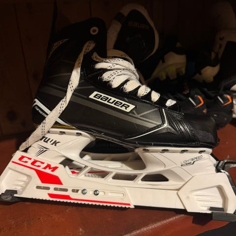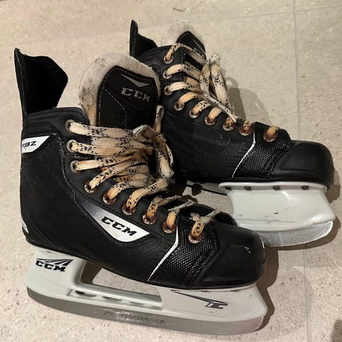 CCM Ishockeyskøyter for barn i størrelse 37. Skøytene er svarte med gule lisser og har hvite holder med stålblad. Passer til ishockey.