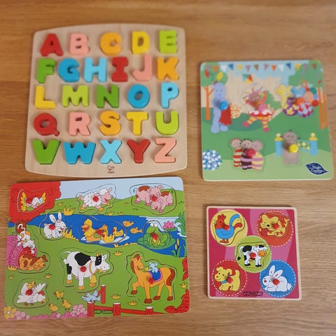 Treleker puslespill med motiver av ulike dyr som krabbe, skilpadde, elefant, hval, fly og bjørn. Puslespillene har fargerike og enkle former som passer for små barn. Laget i tremateriale og designet for å utvikle finmotorikk og gjenkjennelse av dyr.