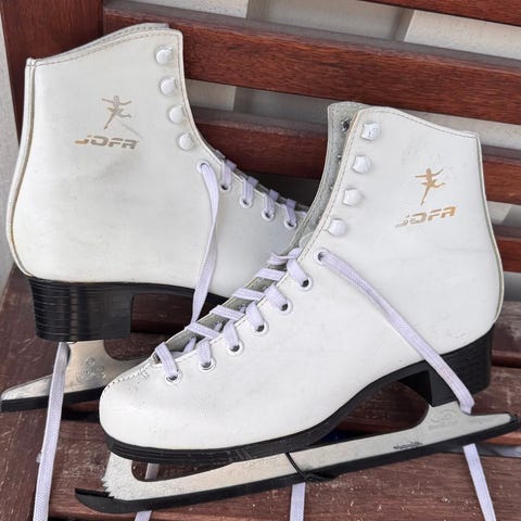 Bauer barn skøyter i størrelse 35, designet for ishockey. Svart farge med hvite lisser og hvit såle. Skøytene har metallblad og er laget for barn.