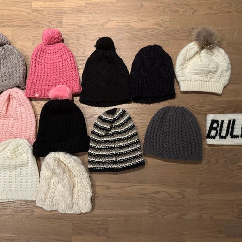 Luer skjerf vanter det meste ikke brukt. Noe brukt 1-2ganger Max Pakken inneholder 3 sett vanter 1sett votter 4 luer 4 skjerf pannebånd og kravesamlet pris kr300