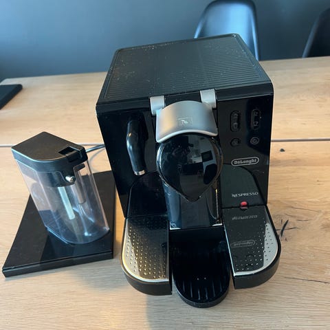 DeLonghi Nespresso kaffemaskin med integrert melkeskummer. Maskinen har et kompakt design og er egnet for bruk med Nespresso-kapsler. Svart farge og enkel betjening med knapper for ulike kaffetyper. Passer til hjemme- eller kontorbruk.