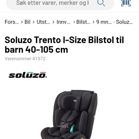 Soluzo Barnesete med størrelse 36. Setet er designet for barn og gir støtte og sikkerhet under biltransport.blitt brukt som reservesete i bil nr 2. med isofix. Kan også brukes uten isofix.
