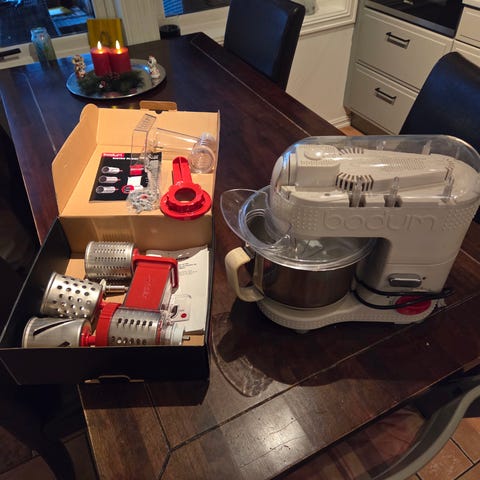 Pent brukt Bodum kjøkkenmaskin med drøyt 4 liters stålbolle selges, fordi nissen kom med en ny i år. Stålbollen har håndtak.