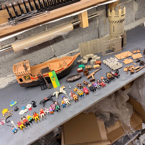 Inneholder et variert utvalg av små figurer og tilbehør i forskjellige farger og former. Pent bruk, med unntak av sjørøverskipet som har vært igjennom noen tøffe stormer.