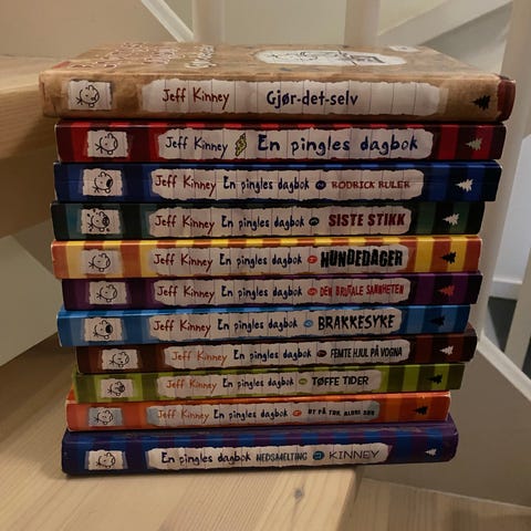 9 bøker i serien "En pingles dagbok". Merk de fire øverste er på norsk, mens resten er på engelsk. Kan kjøpes hver for seg.