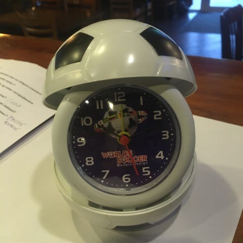 Klokke til barn, denne har en støtte på baksiden som kan vendes ut, slik at den kan stå.