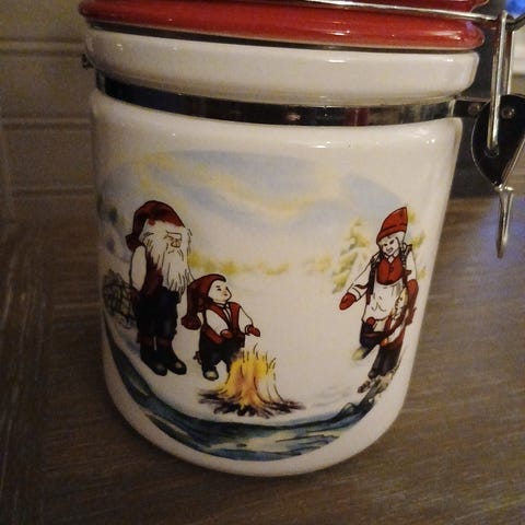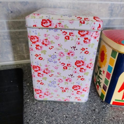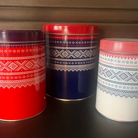 Gamle bokser i metall med ulike dekorative mønstre og farger. Settet inkluderer flere bokser i forskjellige størrelser og former, egnet for oppbevaring av kaker og småbakst.Gamle metallbokser brukt på kjøkkenhylle som dekor. Selger alle 6 stk samlet for 300