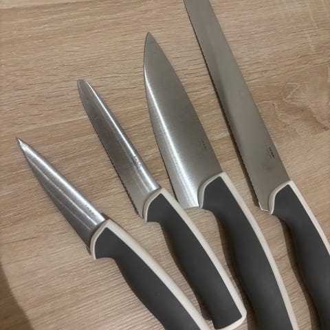 2 kokkekniver fra IKEA og 3 kniver av ukjent merke med logo fra Proaktiv.