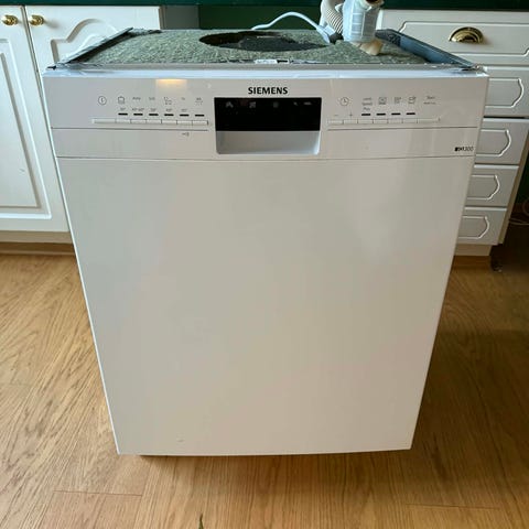 Siemens oppvaskmaskin med hvit front. Designet for integrering under benkeplate med standard oppvaskmaskinfunksjoner og innvendige kurver for oppvask.