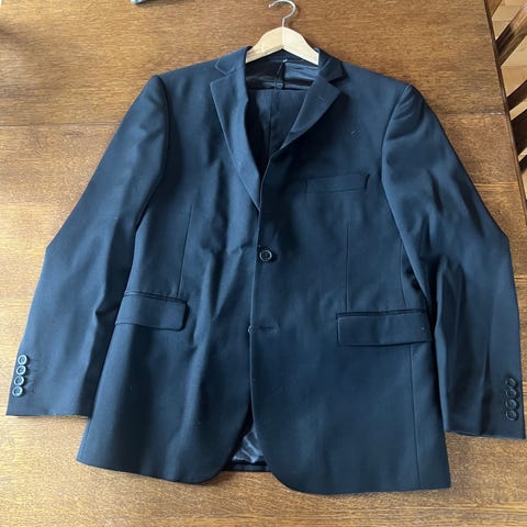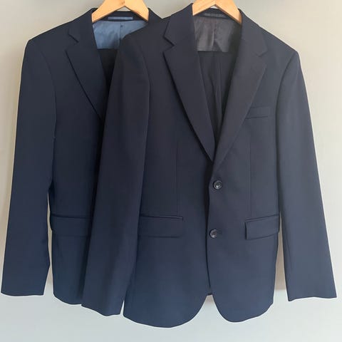 Mørkeblå dress i str XS fra Dressmann. Slim fit. Jakke: str 46, lang. Bukse: 30-32.