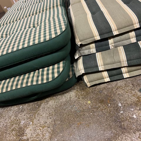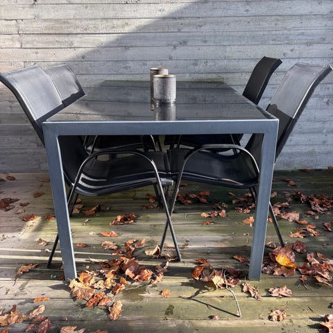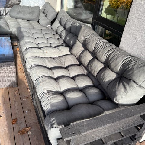 Utemøbler i rotting bestående av en hjørnesofa og et bord. Ødelagt sofa, men fungerer fortsatt. Har "skjult" skadene med pynteputer og tepper. Ingen skader på putene