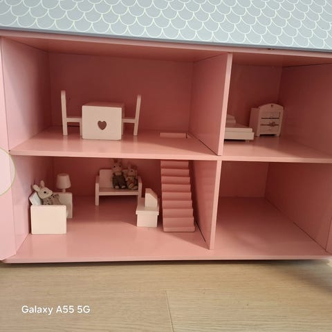 Nydelig dukkehus i hvit og lys rosa malt treverk fra Cloudberry Castle.