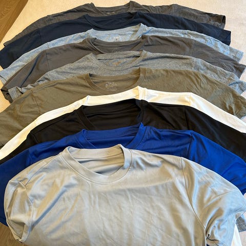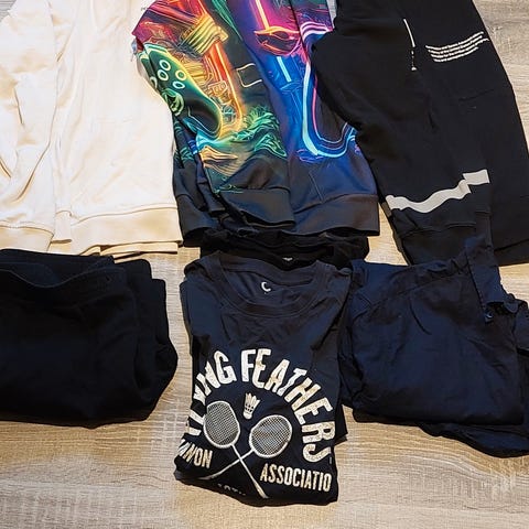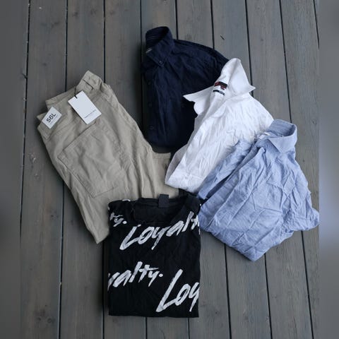 Selger en klespakke med herreklær i str L. Pakken inneholder alt fra T-skjorter uten print, hettegensere, hette jakke, julegenser. Noe klær er mer brukt enn andre, andre nesten ikke brukt.