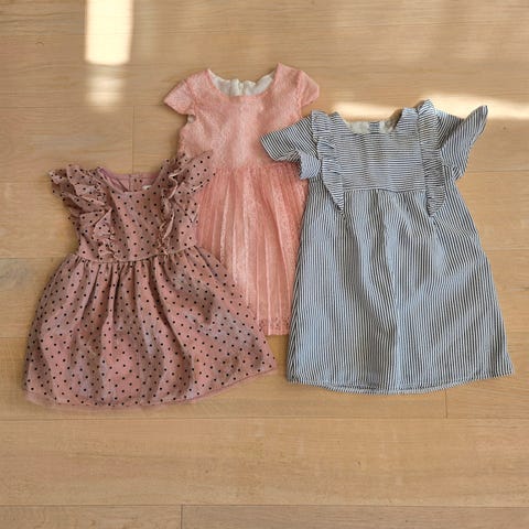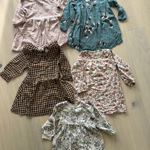 Sett med barnekjoler for jente i størrelse 92. Varierte farger og materialer, egnet for ulike anledninger og daglig bruk.