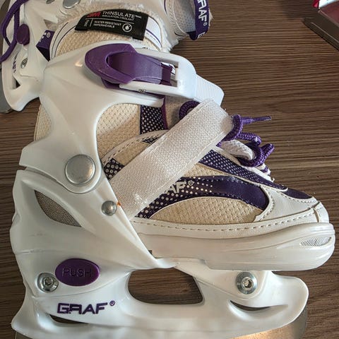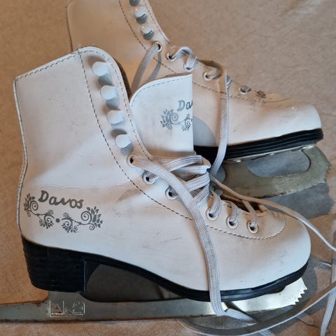 Barneskøyter i størrelse 30 med hvit farge. Egnet for barn og brukt til skøyting. Pris: 50,- pr par