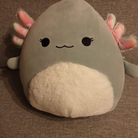 Squishmallows/ mochi pop bamse med lyseblå farge og søt ansiktsuttrykk. Ekstra stor