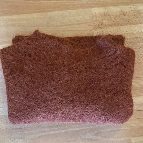 100% merinoull. Er revnet/ gått opp i søm på både bukse og genser, se bilder. Er og en flekk på ene armen.