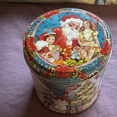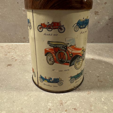 Oppbevaringsboks / kakeboks i metall, med motiver av ulike Ford T biler.