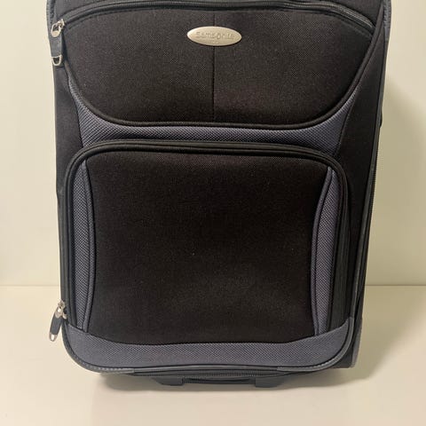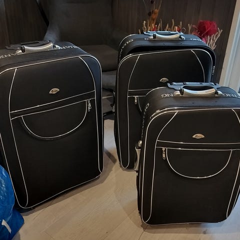 To brukte trillekofferter med fire hjul. Hyller innvendig for oversiktlig pakking og oppbevaring. Som et klesskap på hjul. En vask og de er klare for første fly til granka. Mål på den største høyde 70 cm. Bredde 44 cm dybde 30 cm