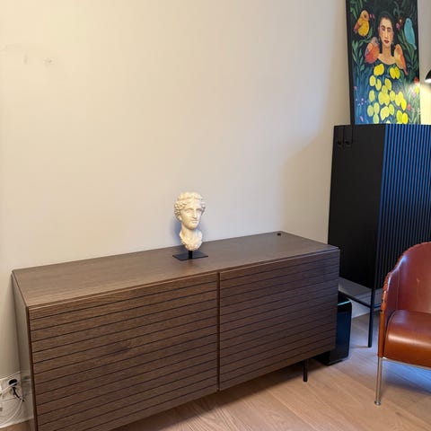 Merk: Skjenken har en liten skade på sidekanten av døren, ikke synlig fra front. Skaden oppsto av varme fra en gulvlampe som stod for nær.