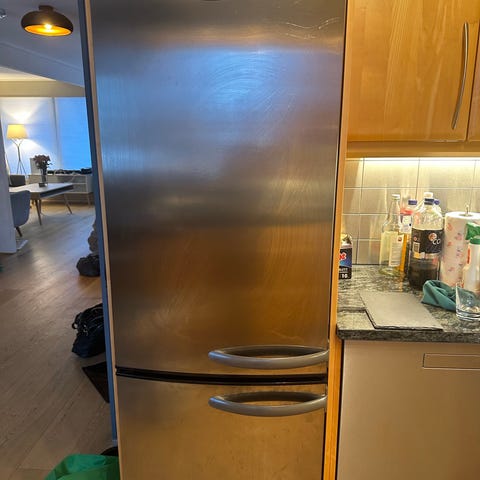 Electrolux kombiskap med rustfritt stål utvendig. Kjøleskap og fryser i ett med flere hyller og skuffer for oppbevaring. Passer til oppbevaring av mat og drikkevarer. Skapet er sikkert 15 år gamnelt men fungerer fint. Ser helt og pent ut.