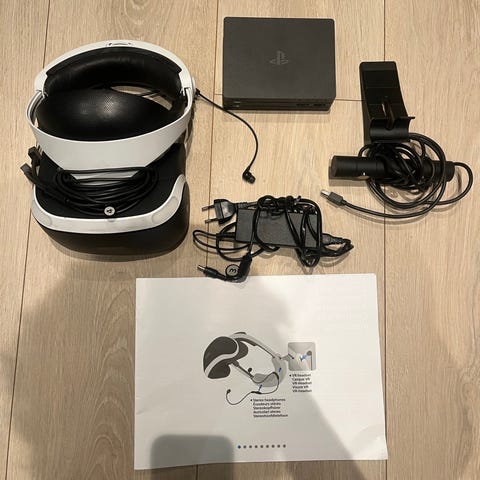 Sony PlayStation VR VR-headset med tilhørende PlayStation 4-konsoll. Inkluderer VR-briller, PlayStation 4-konsoll, samt kabler for tilkobling og strømadapter. Produktet benyttes for virtuell virkelighetsopplevelse og spill på PlayStation-plattformen.