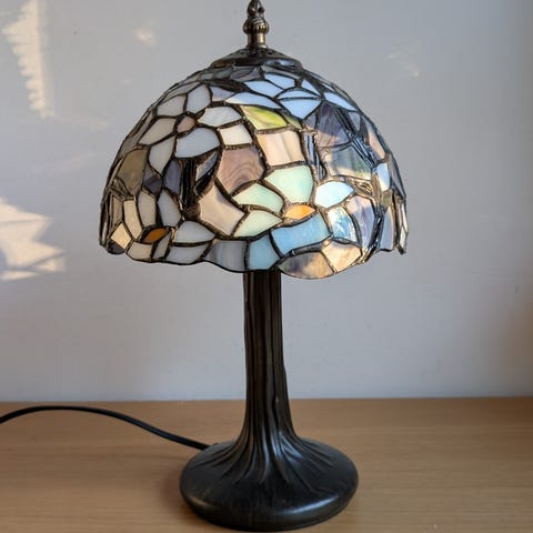 Selger et matchende par dekorative vegglamper i Tiffany-stil med blyinnfattet glass og floralt mønster i grønne, rosa og varme kremtoner.