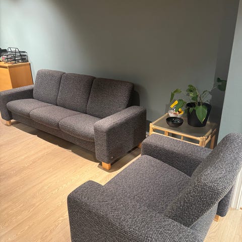 2 kinostoler, toseter sofa m/fotskammel og bord fra Ekornes, selges samlet.