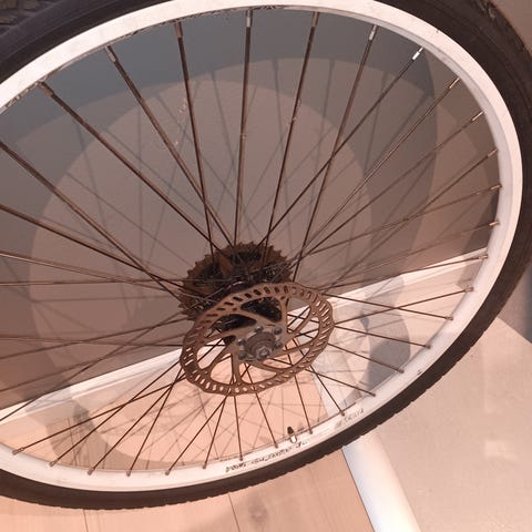 Selger et sykkelhjul med 28" diameter, 8-trinns Shimano-tannhjul og skivebremser.