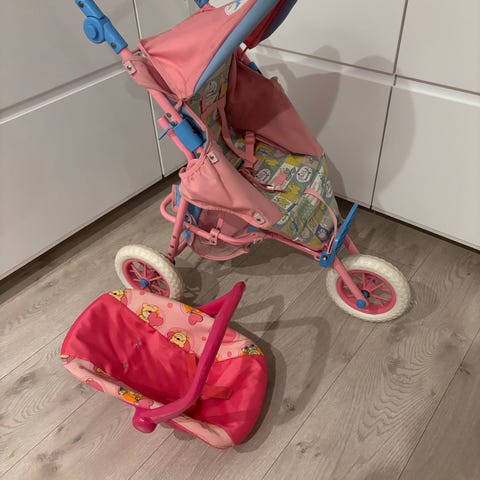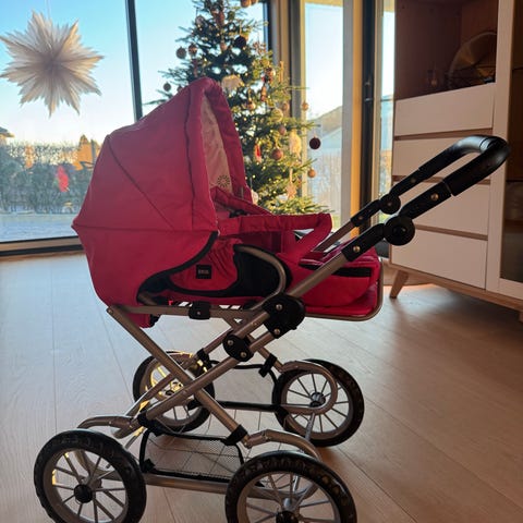BRIO dukkevogn i rosa farge. Vognen har et håndtak for enkel skyving og fire hjul for stabilitet. Inkluderer en tilhørende rosa bæreveske med håndtak. Passer for barn som leker med dukker.