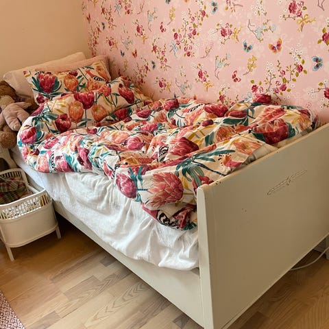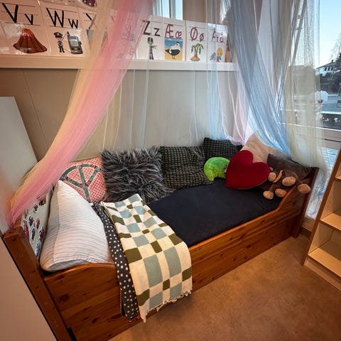 Nydelig eldre/retro barneseng i heltre selges da yngste har vokst ut av den. Den passer perfekt på litt mindre barnerom da den er 190 lang og 89 bred i rammen. 86 bredde til madrass. Vi har brukt en avkappet 80cm madrass fra IKEA i den og det har fungert fint.